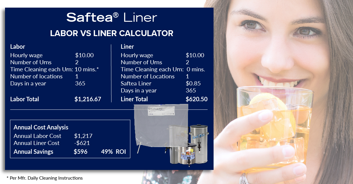 In this scenario, the cost of labor is almost twice the cost of Saftea® Liners and the ROI on Saftea® Liners is 49%. Disposable urn liners cost less than the expense of properly cleaning urns and spigots while improving the quality and flavor of your Iced Tea.